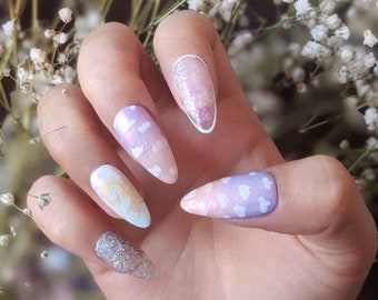 Iridescent Fake Nails Press On Nails Blue Unicorn Acrylic Etsy
