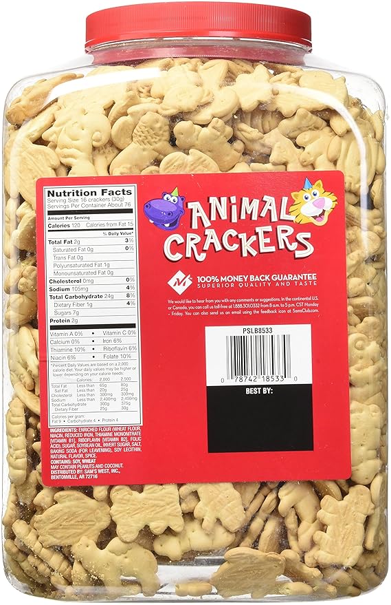 Stauffers Original Animal Crackers. 28 fat 66 carbs 6 protein. Zinc 67.